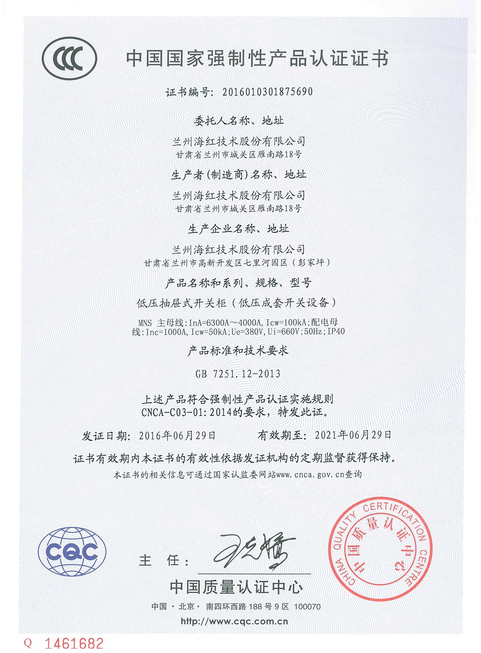 我公司的“低壓抽屜式開關(guān)柜(低壓成套開關(guān)設(shè)備)MNS(6300A-4000A)”通過國家CCC產(chǎn)品認(rèn)證并取得證書