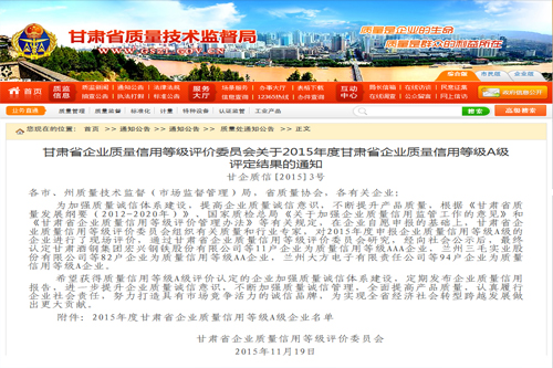 我公司再次被評定為“甘肅省企業(yè)質量信用等級AA級企業(yè)”