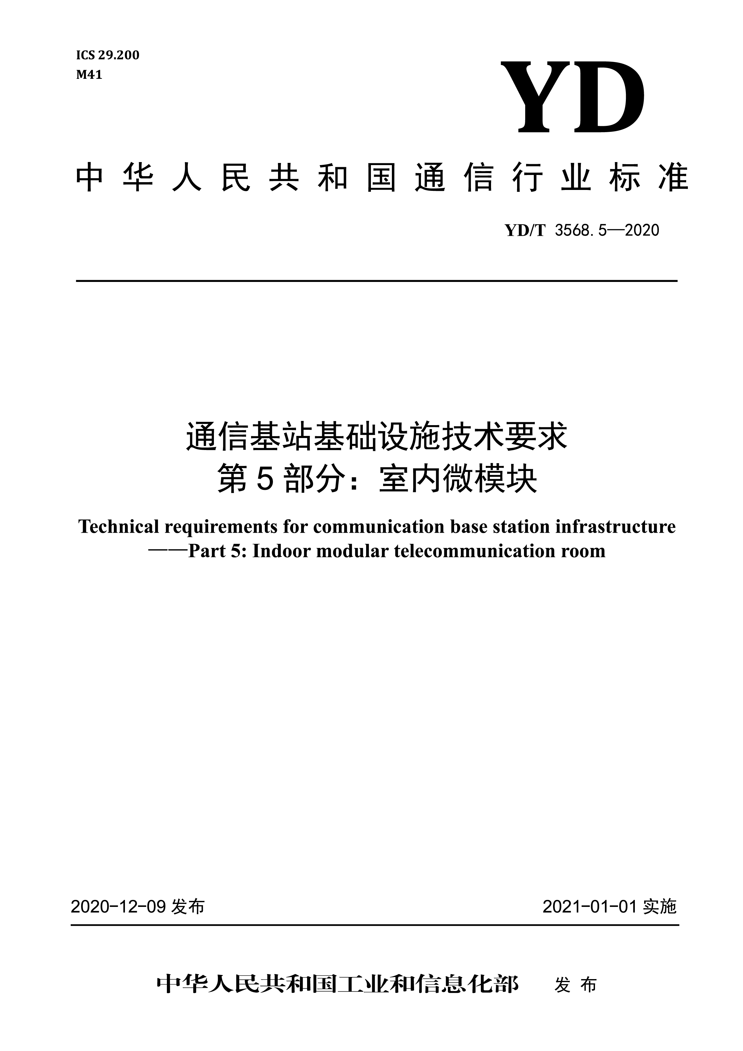 我司參與起草的行業(yè)標(biāo)準(zhǔn)《通信基站基礎(chǔ)設(shè)施技術(shù)要求 第5部分:室內(nèi)微模塊》(YD/T 3568.5-2020)經(jīng)中華人民共和國工業(yè)和信息化部批準(zhǔn)發(fā)布,已于2021年01月01日實(shí)施。...