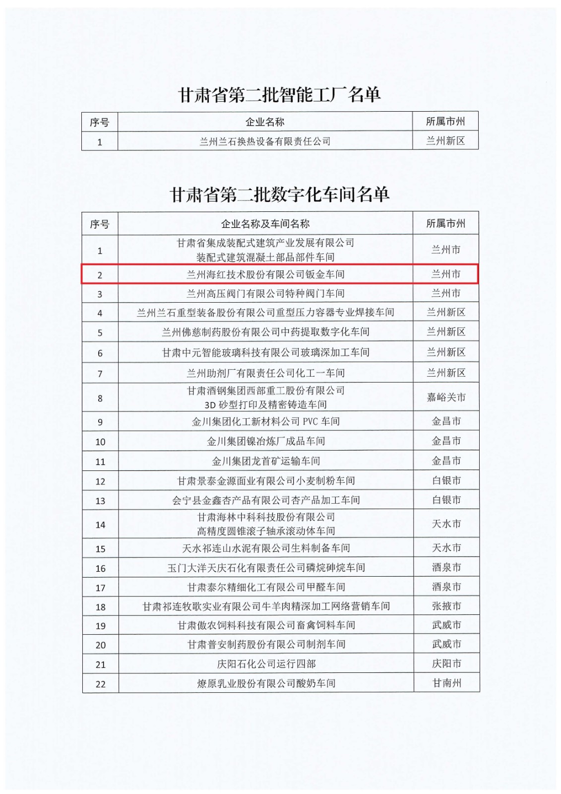 甘肅省工業(yè)和信息化廳發(fā)布甘肅省第二批數(shù)字化車間名單公告,我司鈑金車間被認定為甘肅省第二批“數(shù)字化車間”。