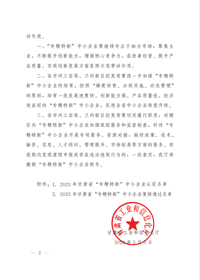 近日,甘肅省工信廳發(fā)布了《關(guān)于公布2023年甘肅省“專精特新”中小企業(yè)和復(fù)核通過企業(yè)名單的公告》(甘工信發(fā)〔2023〕110號),我司通過2023年甘肅省“專精特新”中小企業(yè)復(fù)核。