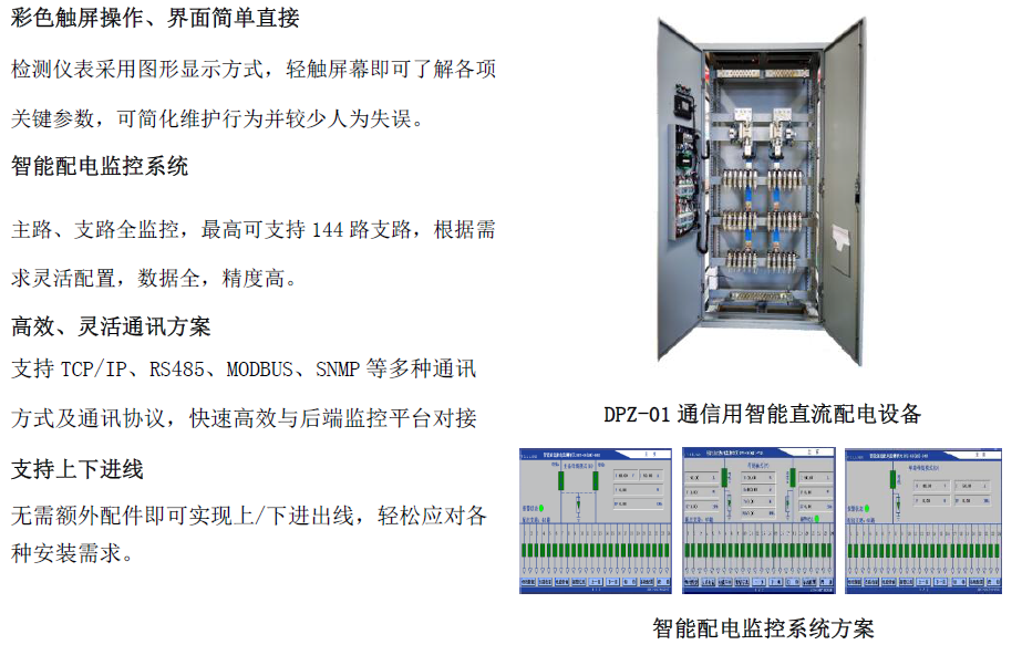 DPZ-01通信用智能直流配電設(shè)備主要是對(duì)直流電能進(jìn)行分配、監(jiān)控、保護(hù),柜內(nèi)配置智能檢測(cè)儀表,滿足配電、監(jiān)控、測(cè)量、保護(hù)、告警等功能。