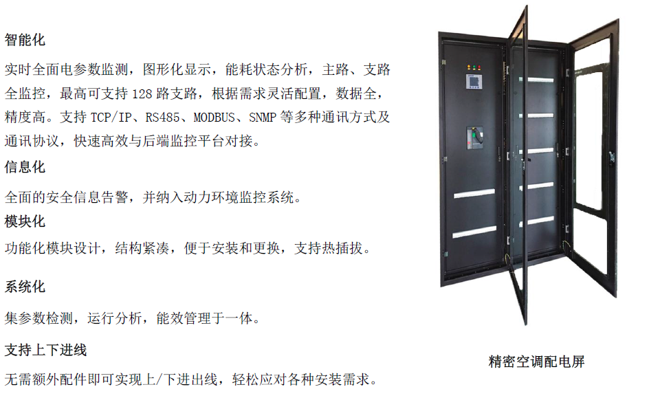 精密空調(diào)配電屏是一款針對(duì)數(shù)據(jù)中心機(jī)房?jī)?nèi)的制冷精密空調(diào)定制化產(chǎn)品,綜合采集所有電氣數(shù)據(jù),實(shí)時(shí)反映電能能耗,分析判斷設(shè)備運(yùn)行狀態(tài),對(duì)整個(gè)配電系統(tǒng)安全運(yùn)行質(zhì)量的有效管理,為實(shí)現(xiàn)全方位綠色數(shù)據(jù)中心機(jī)房提供可靠保障,避免數(shù)據(jù)中心機(jī)房設(shè)備溫度升高會(huì)對(duì)系統(tǒng)運(yùn)行造成嚴(yán)重后果。